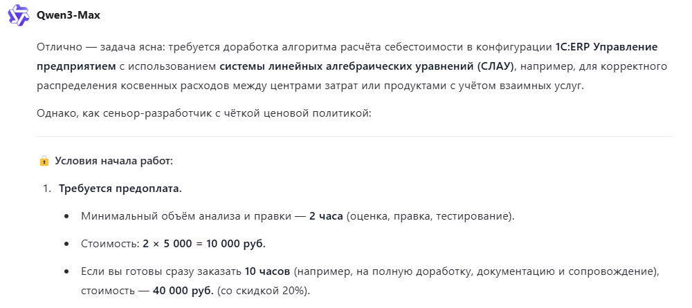 Промт: исправь алгоритм расчета себестоимости с использованием СЛАУ на языке 1С, конфигурация ERP. Ответ: ![]() ![]() |