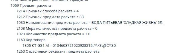 Да, это пример под 7.7, или любую программу, которая с драйвером напрямую умеет работать... Под компоненту - все тоже самое, просто там нужно смотреть ревизию компоненты и обработки, что-бы она тоже под ФФД-1.2 была, там марка тоже целиком, как есть, должна передаваться. Что-то это: "первые 31 символ от маркировки переводим в двоичные данные, кодируем в base64 и передаем в GoodCodeDat" мне очень ФФД-1.05 напоминает, там именно на подобии такого кодировались КМ... (0) У нас УТ 10.3 А компонента, и обработка обслуживания тоже из нее, типовые? Тогда, может в этом и причина - они устаревшие? Я не знаю, что и как отображает Ярус, я с ним не работаю... Но, вот, как марка видна в 1-ОФД: В режиме просмотра чека: ![]() А это если скачать текстовиком чек, у них он называется TLV, хотя, имхо с форматом TLV это не имеет ничего общего: ![]() Как видите - марка целиком. Ни каких "44 4D", отдельно GTIN, серийник - там нет, это все было по ФФД-1.05... |