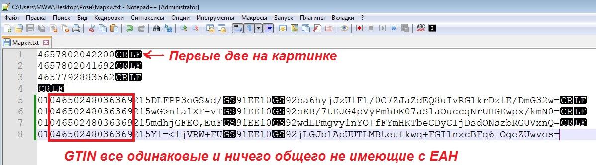 На другом форуме мне написали: В УТ115 вообще нет возможности включить неуникальные штрихкоды. И это, ИМХО правильно! ШК должны быть уникальны. А то, что так сделано в Рознице, это "горбатый костыль"... Но, в данной ситуации, позволяет обойти косяк производителя данного маркированного товара, плохо себе представляющего понятие "ассортимент"... Ну, не знаю, может производитель тут и правильно делает, если этот товар для него это одно и то-же(хотя, не факт - на этикетках на фотке в первом посте и наименования и ШК ЕАН разные...), а уже "на местах", в рознице, его пытаются из ассортимента исключить и сделать отдельными товарами, с разными ценами, типа по принципу - "красненький лучше продается, по этому по 1000 руб, а зелененький хуже, по этому продаем по 500 руб, лишь бы купили"... Такой подход тоже не верный. Если маркированный товар пришел как один "в ассортименте", то и должен продаваться как один, а цены, если нужно, можно менять через скидки или еще как, ЦРПТ это не интересует, для него товар один с одной карточкой, с GTIN в марке... |