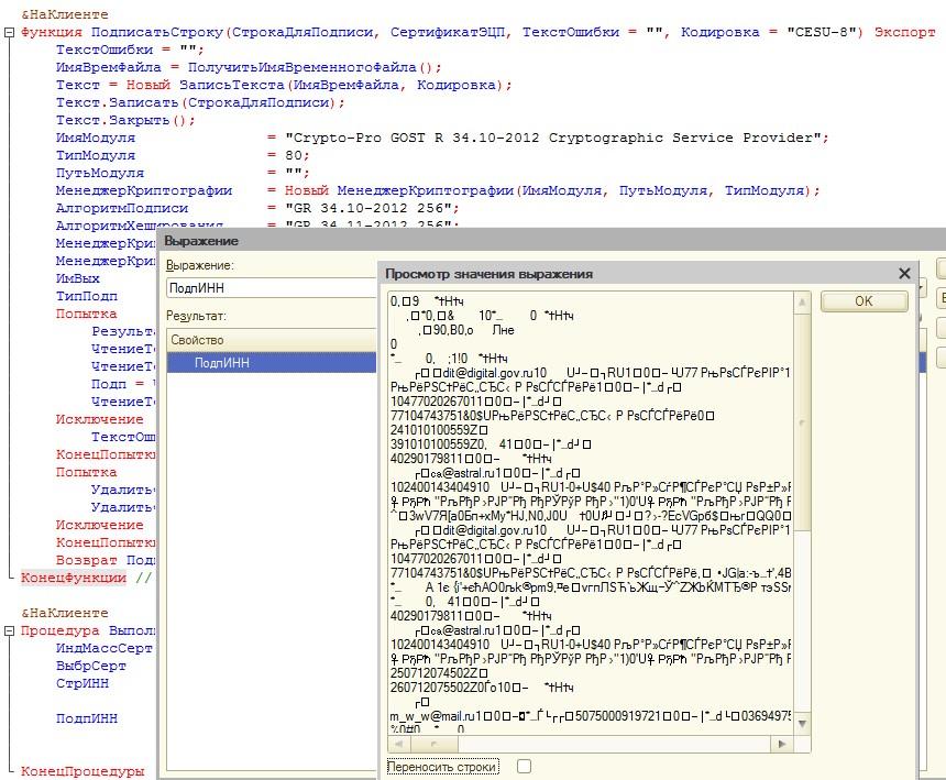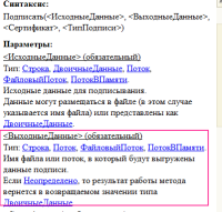 ВходящиеДвоичныеДанные = ПолучитьДвоичныеДанныеИзСтроки(СтрокаДляПодписи); ПодпБин = МенеджерКриптографии.Подписать(ВходящиеДвоичныеДанные, Неопределено, СертификатЭЦП, ТипПодп); // ПодпБин = МенеджерКриптографии.Подписать(ИмяВремФайла, Неопределено, СертификатЭЦП, ТипПодп); Но, на результат это не влияет. |
