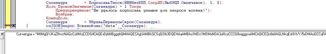 Это видел: "Для самописок без БСП в документации True API: "Пример получения токена при авторизации с прикрепленной подписью / подписание документов с открепленной подписью на 1С"" Но, это по сути то-же самое, что у меня в 7.7 - через CADESCOM, просто там из-за некоторых ограничений приходится Java скрипты использовать, тут можно напрямую с данными работать... Если совсем не получится со штатным объектом "МенеджерКриптографии", то конечно переделаю на CADESCOM, не проблема... Если в клюшках заставил работать через него, тут тем более должно получиться. Но, как-то странно штатный объект работает. Может в этом проблема - "// ТекстДляПодписи должен быть в Base64"... Как-то я про это не подумал, подписываю строку ИНН, а там, как я подумал не критично, так, как только цифры... Но, х.з., надо попробовать... |