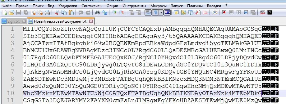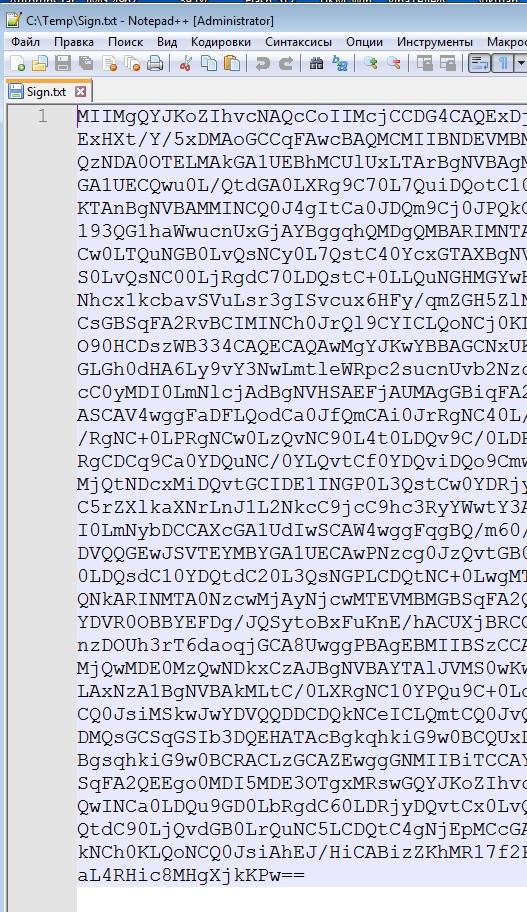 Двоичные данные до преобразования30 82 14 39 06 09 2A 86 48 86 F7 0D 01 07 02 A0 82 14 2A 30 82 14 26 02 01 01 31 0E 30 0C 06 08 2A 85 03 07 01 01 02 02 05 00 30 0B 06 09 2A 86 48 86 F7 0D 01 07 01 A0 82 10 39 30 82 07 C2 30 82 07 6F A0 03 02 01 02 02 0B 00 CB 7F ED E5 00 00 00 00 0A 08 30 0A 06 08 2A 85 03 07 01 01 03 02 30 82 01 3B 31 21 30 1F 06 09 2A 86 48 86 F7 0D 01 09 01 16 12 64 69 74 40 64 69 67 69 74 61 6C 2E 67 6F 76 2E 72 75 31 0B 30 09 06 03 55 04 06 13 02 52 55 31 18 30 16 06 03 55 04 08 0C 0F 37 37 20 D0 9C D0 BE D1 81 D0 BA D0 B2 D0 B0 31 19 30 17 06 03 55 04 07 0C 10 D0 B3 2E 20 D0 9C D0 BE D1 81 D0 BA D0 B2 D0 B0 31 53 30 51 06 03 55 04 09 0C 4A D0 9F D1 80 D0 B5 D1 81 D0 BD D0 B5 D0 BD D1 81 D0 BA D0 B0 D1 8F 20 D0 BD D0 B0 D0 B1 D0 B5 D1 80 D0 B5 D0 B6 D0 BD D0 B0 D1 8F... Похоже на правду... А это в Basa64"MIIUOQYJKoZIhvcNAQcCoIIUKjCCFCYCAQExDjAMBggqhQMHAQECAgUAMAsGCSqG SIb3DQEHAaCCEDkwggfCMIIHb6ADAgECAgsAy3/t5QAAAAAKCDAKBggqhQMHAQED AjCCATsxITAfBgkqhkiG9w0BCQEWEmRpdEBkaWdpdGFsLmdvdi5ydTELMAkGA1UE BhMCUlUxGDAWBgNVBAgMDzc3INCc0L7RgdC60LLQsDEZMBcGA1UEBwwQ0LMuINCc 0L7RgdC60LLQsDFTMFEGA1UECQxK0J/RgNC10YHQvdC10L3RgdC60LDRjyDQvdCw 0LHQtdGA0LXQttC90LDRjywg0LTQvtC8IDEwLCDRgdGC0YDQvtC10L3QuNC1IDIx JjAkBgNVBAoMHdCc0LjQvdGG0LjRhNGA0Ysg0KDQvtGB0YHQuNC4MRgwFgYFKoUD ZAESDTEwNDc3MDIwMjY3MDExFTATBgUqhQNkBBIKNzcxMDQ3NDM3NTEmMCQGA1UE Awwd0JzQuNC90YbQuNGE0YDRiyDQoNC+0YHRgdC40LgwHhcNMjQxMDEwMTAwNTU5 WhcNMzkxMDEwMTAwNTU5WjCCATQxFTATBgUqhQNkBBIKNDAyOTAxNzk4MTEbMBkG CSqGSIb3DQEJARYMY2FAYXN0cmFsLnJ1MRgwFgYFKoUDZAESDTEwMjQwMDE0MzQw NDkxCzAJBgNVBAYTAlJVMS0wKwYDVQQIDCQ0MCDQmtCw0LvRg9C20YHQutCw0Y8g 0L7QsdC70LDRgdGC0YwxGTAXBgNVBAcMENCzLiDQmtCw0LvRg9Cz0LAxNzA1BgNV BAkMLtC/0LXRgNC10YPQu9C+0Log0KLQtdGA0LXQvdC40L3RgdC60LjQuSwg0LQu IDYxKTAnBgNVBAoMINCQ0J4gItCa0JDQm9Cj0JPQkCDQkNCh0KLQoNCQ0JsiMSkw JwYDVQQDDCDQkNCeICLQmtCQ0JvQo9CT0JAg0JDQodCi0KDQkNCbIjBmMB8GCCqF AwcBAQEBMBMGByqFAwICIwEGCCqFAwcBAQICA0MABED8wUC+3zmhGwF+AVReK7cl VGq4svE4VcooTz4DBm8S0QtZM4F2jZ/lsid3Cl4QM3dWN98HWxzgMMHvK/XM8ypI o4IETjCCBEowCwYDVR0PBAQDAgGGMB0GA1UdDgQWBBQ/m60/RZjxVkeYcOEkGZxy GlEEUTASBgNVHRMBAf8ECDAGAQH/AgEAMCUGA1UdIAQeMBwwCAYGKoUDZHECMAgG BiqFA2RxATAGBgRVHSAAMCsGA1UdEAQkMCKADzIwMjQxMDA4MTM0NTQwWoEPMjAy NzEwMDgxMzQ1NDBaMFQGBSqFA2RvBEsMSSLQmtGA0LjQv9GC0L7Qn9GA0L4gQ1NQ IiAo0LLQtdGA0YHQuNGPIDQuMCkgKNC40YHQv9C+0LvQvdC10L3QuNC1IDItQmFz ZSkwFAYJKwYBBAGCNxQCBAcMBVN1YkNBMBIGCSsGAQQBgjcVAQQFAgMJAAkwggF9 BgNVHSMEggF0MIIBcIAUyRNYsUynYjp+0j88pucUfJ1wo4ahggFDpIIBPzCCATsx ITAfBgkqhkiG9w0BCQEWEmRpdEBkaWdpdGFsLmdvdi5ydTELMAkGA1UEBhMCUlUx GDAWBgNVBAgMDzc3INCc0L7RgdC60LLQsDEZMBcGA1UEBwwQ0LMuINCc0L7RgdC6 0LLQsDFTMFEGA1UECQxK0J/RgNC10YHQvdC10L3RgdC60LDRjyDQvdCw0LHQtdGA 0LXQttC90LDRjywg0LTQvtC8IDEwLCDRgdGC0YDQvtC10L3QuNC1IDIxJjAkBgNV BAoMHdCc0LjQvdGG0LjRhNGA0Ysg0KDQvtGB0YHQuNC4MRgwFgYFKoUDZAESDTEw NDc3MDIwMjY3MDExFTATBgUqhQNkBBIKNzcxMDQ3NDM3NTEmMCQGA1UEAwwd0JzQ uNC90YbQuNGE0YDRiyDQoNC+0YHRgdC40LiCEQCVH6NHfGEEOq36hYYngjRCMGgG A1UdHwRhMF8wLaAroCmGJ2h0dHA6Ly9jcmwuZ29zdXNsdWdpLnJ1L2NkcC9ndWMy MDIyLmNybDAuoCygKoYoaHR0cDovL2NybDIuZ29zdXNsdWdpLnJ1L2NkcC9ndWMy MDIyLmNybDBDBggrBgEFBQcBAQQ3MDUwMwYIKwYBBQUHMAKGJ2h0dHA6Ly9jcmwu Z29zdXNsdWdpLnJ1L2NkcC9ndWMyMDIyLmNydDCB9QYFKoUDZHAEgeswgegMNNCf 0JDQmtCcIMKr0JrRgNC40L/RgtC+0J/RgNC+IEhTTcK7INCy0LXRgNGB0LjQuCAy LjAMQ9Cf0JDQmiDCq9CT0L7Qu9C+0LLQvdC+0Lkg0YPQtNC+0YHRgtC+0LLQtdGA 0Y/RjtGJ0LjQuSDRhtC10L3RgtGAwrsMNdCX0LDQutC70Y7Rh9C10L3QuNC1IOKE liAxNDkvMy8yLzIvMjMg0L7RgiAwMi4wMy4yMDE4DDTQl9Cw0LrQu9GO0YfQtdC9 0LjQtSDihJYgMTQ5LzcvNi00NDkg0L7RgiAzMC4xMi4yMDIxMAwGBSqFA2RyBAMC AQEwCgYIKoUDBwEBAwIDQQAxuqB7sycrup5BTzCaa67wbTmCpGUZduPvy72OYPzG +ZahXlrGYo3MVICu0ADy/b297E4He/mFNMSnbccWKR/TMIIIbzCCCBygAwIBAgIR Cfx4ggAYs2SoTEde39j/nEMwCgYIKoUDBwEBAwIwggE0MRUwEwYFKoUDZAQSCjQw MjkwMTc5ODExGzAZBgkqhkiG9w0BCQEWDGNhQGFzdHJhbC5ydTEYMBYGBSqFA2QB Eg0xMDI0MDAxNDM0MDQ5MQswCQYDVQQGEwJSVTEtMCsGA1UECAwkNDAg0JrQsNC7 0YPQttGB0LrQsNGPINC+0LHQu9Cw0YHRgtGMMRkwFwYDVQQHDBDQsy4g0JrQsNC7 0YPQs9CwMTcwNQYDVQQJDC7Qv9C10YDQtdGD0LvQvtC6INCi0LXRgNC10L3QuNC9 0YHQutC40LksINC0LiA2MSkwJwYDVQQKDCDQkNCeICLQmtCQ0JvQo9CT0JAg0JDQ odCi0KDQkNCbIjEpMCcGA1UEAwwg0JDQniAi0JrQkNCb0KPQk9CQINCQ0KHQotCg 0JDQmyIwHhcNMjUwNzEyMDc0NTAyWhcNMjYwNzEyMDc1NTAyWjCB7jEcMBoGCSqG SIb3DQEJARYNbV93X3dAbWFpbC5ydTEaMBgGCCqFAwOBAwEBEgw1MDc1MDAwOTE5 NzIxFjAUBgUqhQNkAxILMDM2OTQ5NzU5MTQxNjA0BgNVBCoMLdCS0LvQsNC00LjR gdC70LDQsiDQktC70LDQtNC40YHQu9Cw0LLQvtCy0LjRhzEZMBcGA1UEBAwQ0JzQ tdC00LLQtdC00LXQsjFHMEUGA1UEAww+0JzQtdC00LLQtdC00LXQsiDQktC70LDQ tNC40YHQu9Cw0LIg0JLQu9Cw0LTQuNGB0LvQsNCy0L7QstC40YcwZjAfBggqhQMH AQEBATATBgcqhQMCAiMBBggqhQMHAQECAgNDAARAd9bJ7zl7HQdUog4McwF+Ba79 cnMAK6E7aUZlLuggTVU2FzHWRxtq9JW4uyveAhK9y7HocXL+qZkYflmU1H2HDqOC BUMwggU/MA4GA1UdDwEB/wQEAwID+DAmBgNVHSUEHzAdBgcqhQMFARwCBggrBgEF BQcDAgYIKwYBBQUHAwQwKwYFKoUDZG8EIgwg0KHQmtCX0JggItCg0KPQotCe0JrQ ldCdINCt0KbQnyIwDAYFKoUDZHIEAwIBADA0BgkrBgEEAYI3FQcEJzAlBh0qhQMC AjIBCcGAOYTu/geE6YImg73QcIOzNYHffgIBAQIBADAyBgkrBgEEAYI3FQoEJTAj MAkGByqFAwUBHAIwCgYIKwYBBQUHAwIwCgYIKwYBBQUHAwQwgYUGCCsGAQUFBwEB BHkwdzA4BggrBgEFBQcwAYYsaHR0cDovL29jc3Aua2V5ZGlzay5ydS9vY3NwLWNw LTIwMjQvb2NzcC5zcmYwOwYIKwYBBQUHMAKGL2h0dHA6Ly9kcC5rZXlkaXNrLnJ1 L3Jvb3QvY3AvYXN0cmFsLWNwLTIwMjQuY2VyMB0GA1UdIAQWMBQwCAYGKoUDZHEB MAgGBiqFA2RxAjArBgNVHRAEJDAigA8yMDI1MDcxMjA3NDUwMlqBDzIwMjYwNzEy MDc0NTAyWjCCAWkGBSqFA2RwBIIBXjCCAVoMUtCh0JrQl9CYICLQmtGA0LjQv9GC 0L7Qn9GA0L4gQ1NQIiAo0LLQtdGA0YHQuNGPIDQuMCkgKNC40YHQv9C+0LvQvdC1 0L3QuNC1IDItQmFzZSkMgbvQn9GA0L7Qs9GA0LDQvNC80L3Qvi3QsNC/0L/QsNGA 0LDRgtC90YvQuSDQutC+0LzQv9C70LXQutGBIMKr0KPQtNC+0YHRgtC+0LLQtdGA 0Y/RjtGJ0LjQuSDRhtC10L3RgtGAIMKr0JrRgNC40L/RgtC+0J/RgNC+INCj0KbC uyDQstC10YDRgdC40LggMi4wwrsgKNCy0LDRgNC40LDQvdGCINC40YHQv9C+0LvQ vdC10L3QuNGPIDUpDCfQodCkLzEyNC00NzEyINC+0YIgMTUg0Y/QvdCy0LDRgNGP IDIwMjQMHdCh0KQvMTI4LTQyNzAg0L7RgiAxMy4wNy4yMDIyMIGEBgNVHR8EfTB7 MDigNqA0hjJodHRwOi8vd3d3LmRwLmtleWRpc2sucnUvY2RwL2NwL2FzdHJhbC1j cC0yMDI0LmNybDA/oD2gO4Y5aHR0cDovL3d3dy5kcC10ZW5kZXIua2V5ZGlzay5y dS9jZHAvY3AvYXN0cmFsLWNwLTIwMjQuY3JsMIIBdwYDVR0jBIIBbjCCAWqAFD+b rT9FmPFWR5hw4SQZnHIaUQRRoYIBQ6SCAT8wggE7MS