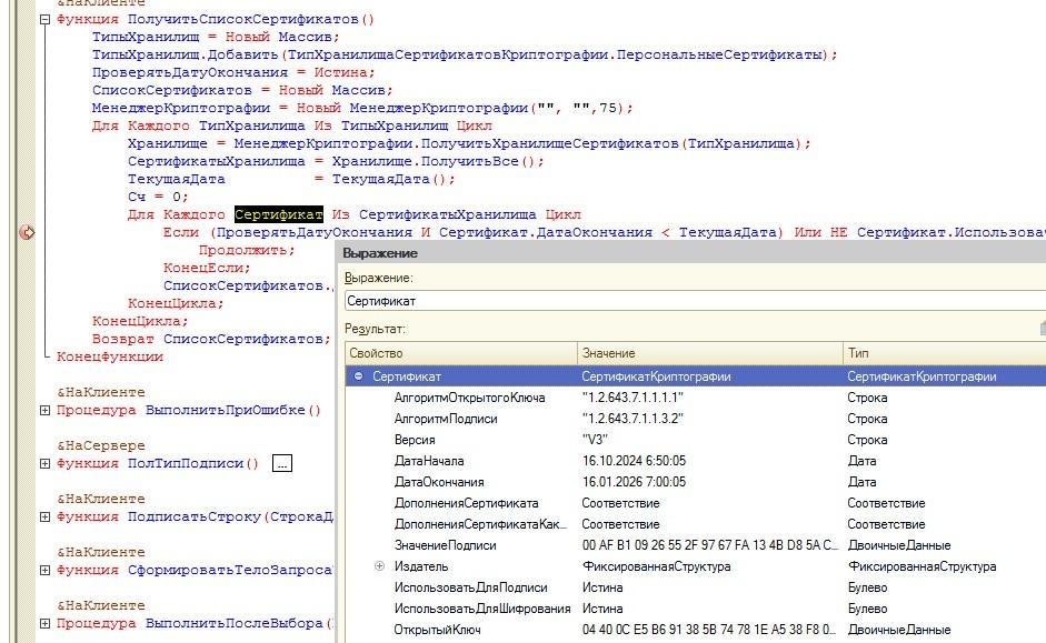 Выдает ошибку - не соответствие типа параметр 3. Так отрабатывает: Подп = Base64Строка(МенеджерКриптографии.Подписать(ИмяВремФайла, Неопределено, СертификатЭЦП, ТипПодп)); И даже визуально нечто похожее на правильную возвращается, но ЧЗ ее не переваривает - запрос токена ошибку 403 возвращает с такой ЭЦП, типа доступ по такой ЭЦП запрещен... |